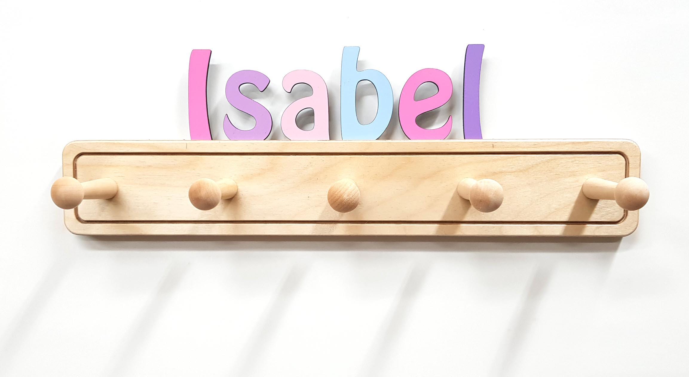 Your children or grand children will love having their own colorful coat rack with their name on top! This colorful and unique personalized coat rack is perfect for any bedroom or nursery. Having their own coat rack can also give your child incentive to hang up their coat and hat, thus keeping their room clean and neat. Each hanger is 18" wide and has 5 pegs. Two keyhole slots are cut in the back for easy mounting flush to the wall.