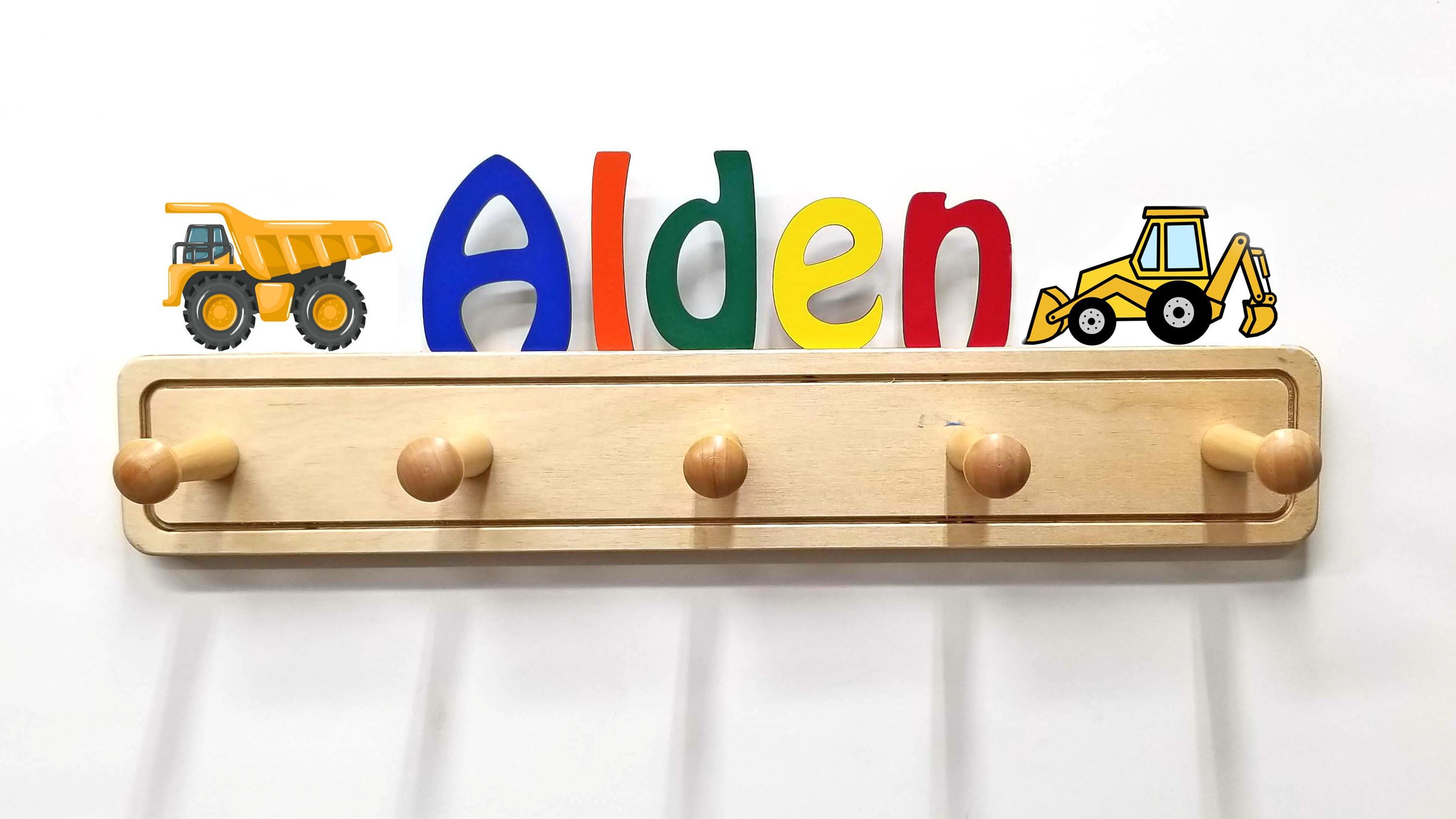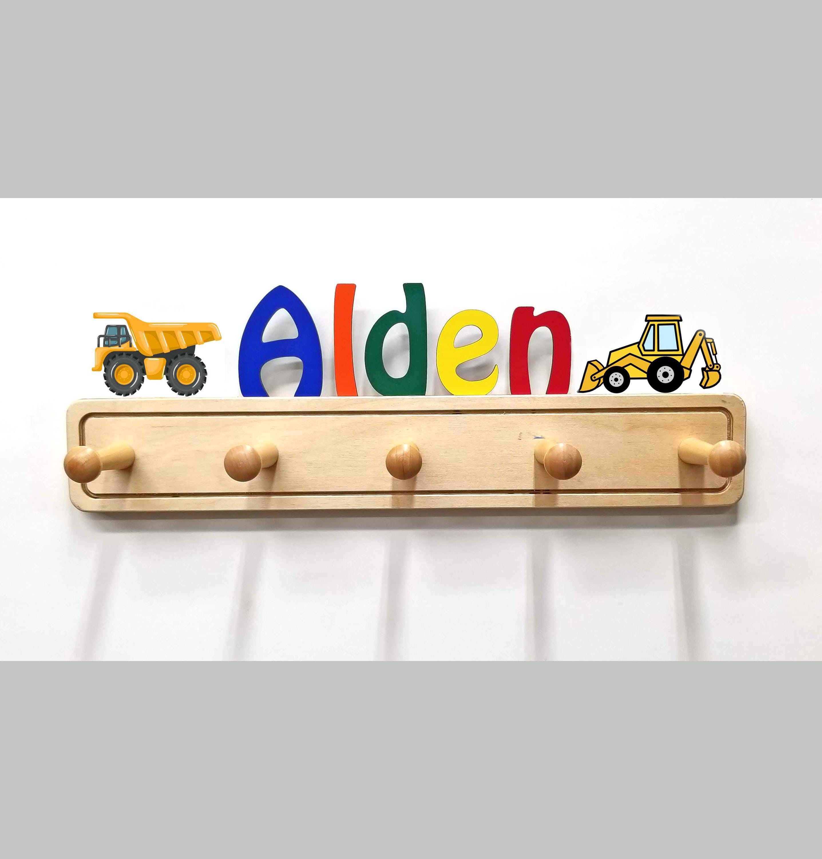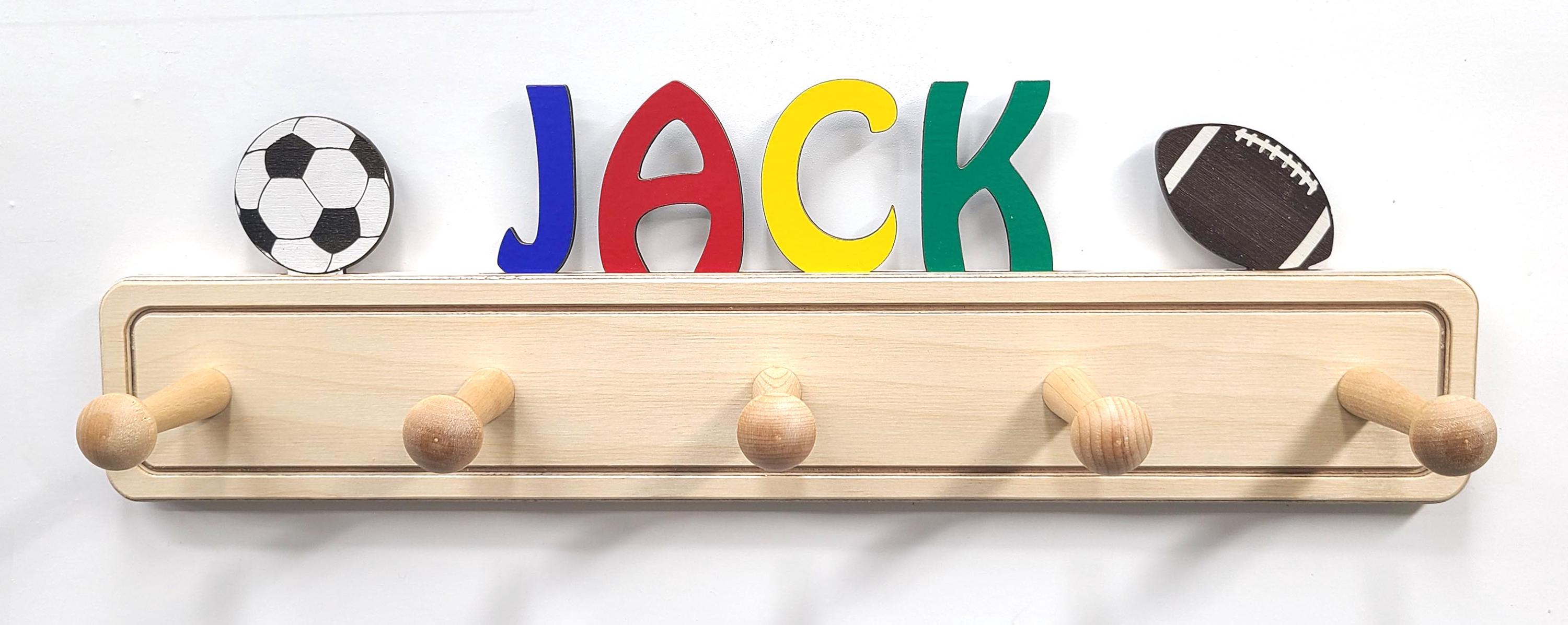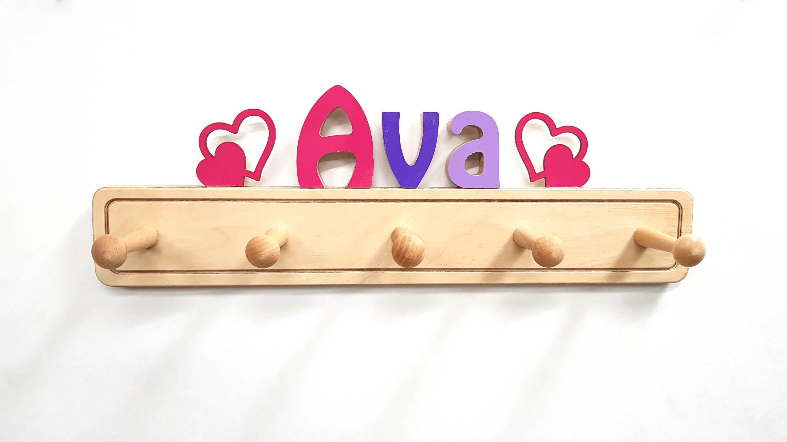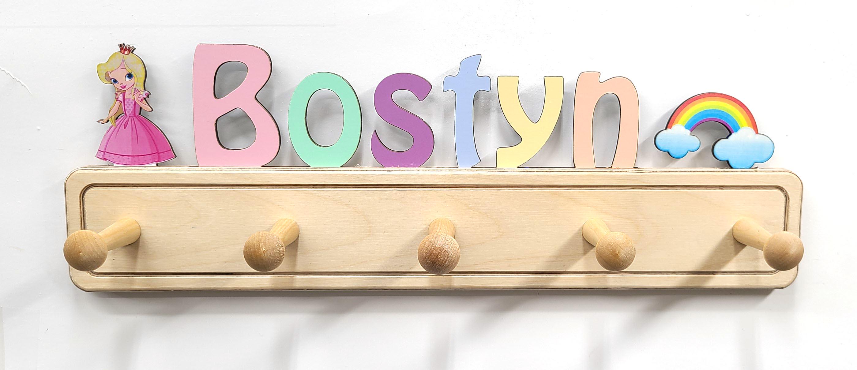 Your children or grand children will love having their own colorful coat rack with their name on top! This colorful and unique personalized coat rack is perfect for any bedroom or nursery. In addition to a colorful name, you can add ornaments to your custom coat rack. You can have a total of 9 letters and ornaments with a maximum or 2 ornaments (they don't need to match). Each hanger is 18" wide and has 5 pegs. Two keyhole slots are cut in the back for easy mounting flush to the wall.