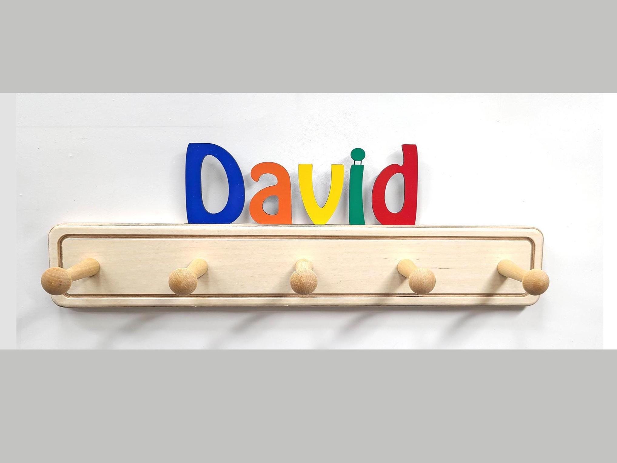 Your children or grand children will love having their own colorful coat rack with their name on top! This colorful and unique personalized coat rack is perfect for any bedroom or nursery. Having their own coat rack can also give your child incentive to hang up their coat and hat, thus keeping their room clean and neat. Each hanger is 18" wide and has 5 pegs. Two keyhole slots are cut in the back for easy mounting flush to the wall.